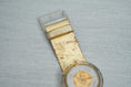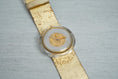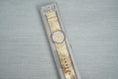 This rare Pop Swatch "Guinevere" PWK169 from 1992 is a striking vintage watch with a unique golden appearance. The watch features a bright 39 mm case and a beautiful gold-colored strap with subtle, medieval motifs that give this model a royal touch. This model is part of the iconic Pop Swatch series, where the movement can be removed from the strap and worn as an accessory in other ways, highlighting the versatility of the design. Condition - Quality score: Silver - Tested working: Yes, the watch functions properly and keeps time accurately. Specific condition remarks: - The watch itself is in good condition, with minimal signs of use on the case. - The original gold bracelet shows clear signs of use, which enhances the vintage look and emphasizes the character of the watch. - Delivered in the original packaging, including the unique Swatch Pop system, which allows the watch to be detached from the strap. This watch is perfect for collectors of Swatch watches and lovers of unique, creative designs from the 90s. The "Guinevere" PWK169 is a true work of art that is both timeless and playful.
